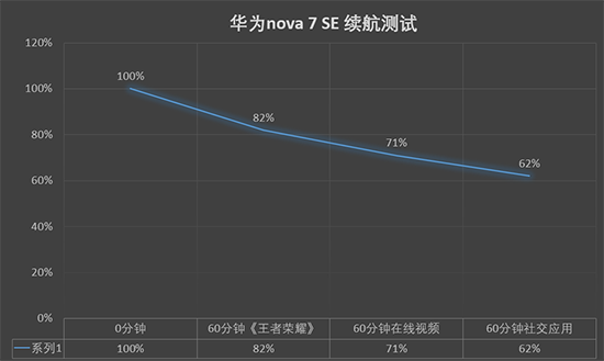 我們對華為nova7 SE進行3小時常規(guī)續(xù)航測試,在經(jīng)過60分鐘在線視頻播放、60分鐘社交軟件、60分鐘《王者榮耀》后,剩余電量為62%,總的來說,華為nova7 SE續(xù)航表現(xiàn)還是不錯的,普通用戶使用可以輕松滿足一天一充。