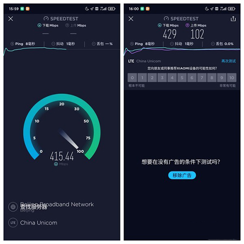 目前5G網(wǎng)絡(luò)已經(jīng)基本覆蓋北京市區(qū),經(jīng)過我們的實(shí)測,Redmi K30至尊紀(jì)念版的5G下行速度可以達(dá)到429Mbps左右,這幾乎達(dá)到了我們這張5G卡的速度極限。而當(dāng)你擁有更多的5G卡時,雙5G雙卡雙待等特性,也會為你帶來更加良好的使用體驗。在5G網(wǎng)絡(luò)逐步普及的今天,搭載天璣1000+的Redmi K30至尊紀(jì)念版的表現(xiàn)已經(jīng)能讓我們感到滿意。