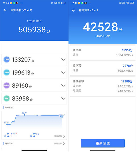 我們就實際為Redmi K30 至尊紀念版進行跑分。我們使用安兔兔進行綜合跑分和存儲測試。綜合跑分方面,Redmi K30 至尊紀念版得分505938分,UX單項得分83958分。存儲測試方面,Redmi K30 至尊紀念版測出的順序讀寫速度分別為1004.0MB/s和508.4MB/s,隨機讀寫速度分別為246.2MB/s和248.5MB/s。