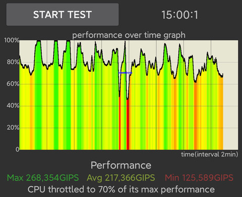 為了測試Redmi K30 至尊紀念版的性能穩(wěn)定性表現(xiàn),我們使用CPU Throttling Test進行了CPU拷機,看一看Redmi K30 至尊紀念版的極限算力表現(xiàn)。在15分鐘的測試過程中,天璣820處理器的CPU可以發(fā)揮出至少70%的算力,并沖到了最高的2.60GHz主頻。