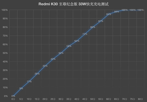 我們將Redmi K30 至尊紀(jì)念版的電量放光,進(jìn)行充電測試,半小時(shí)充電50%,在第70分鐘充滿,作為一款5G手機(jī),表現(xiàn)還是相當(dāng)穩(wěn)的。由此可見,Redmi K30 至尊紀(jì)念版的5G網(wǎng)絡(luò)連接能力和整體續(xù)航水平還是非常給力的。