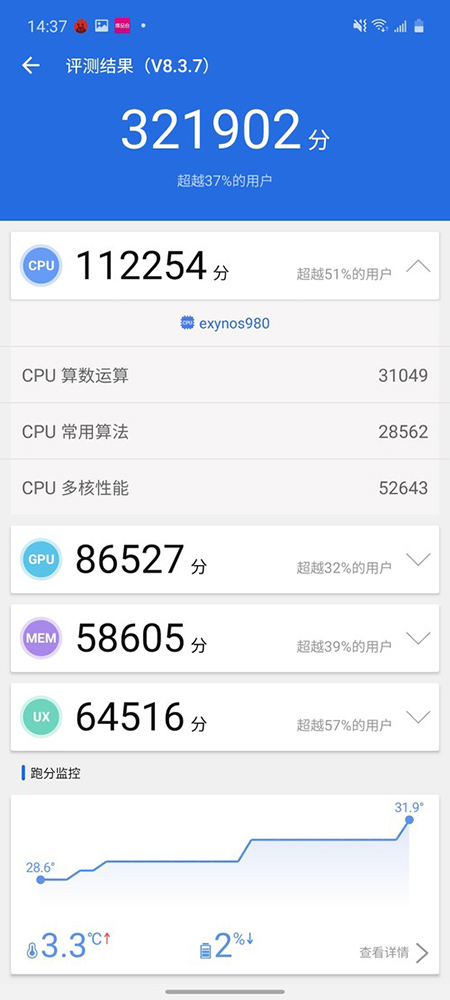 在性能方面,三星Galaxy A51采用了自家的 Exynos 980處理器芯片,支持了5G網(wǎng)絡(luò)。從官方給出的參數(shù)看,Exyons 980的參數(shù)表現(xiàn)較為出色。而且這款處理器芯片全球首發(fā)了Cortex-A77公版CPU架構(gòu),相比Cortex-A76同頻率核心,性能有較大的提升。性能提升幅度高達20%,通過安兔兔的跑分測試我們可以看出,這款產(chǎn)品的32萬的成績表現(xiàn)有著與高通7系處理器接近的成績表現(xiàn)。