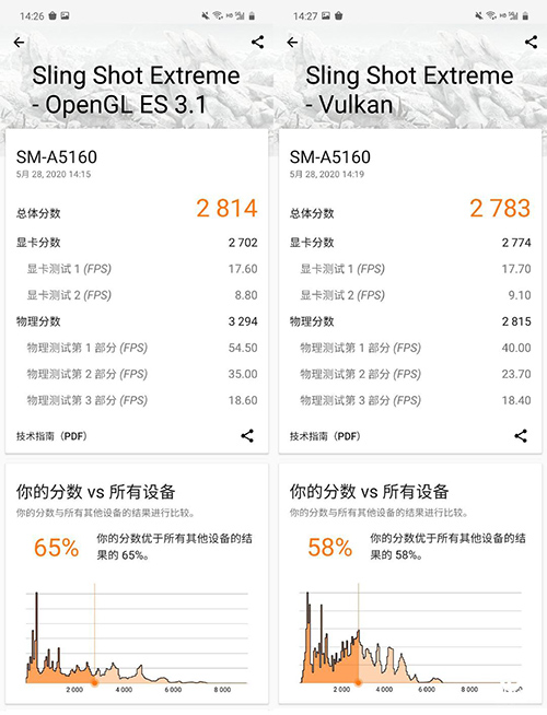 讓我們再借助3DMark對三星Galaxy A51 5G智能手機的基準性能進行測試,評測分為OPEN GL ES 3.1和Vulkan兩個部分,三星Galaxy A51 5G智能手機的得分為2814分和2783分,分別優(yōu)于65%和58%的其它設(shè)備。