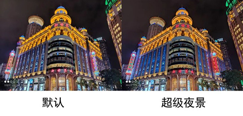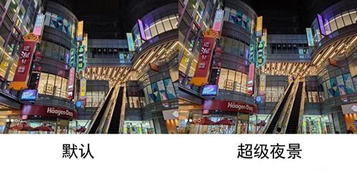 在有些場(chǎng)景下,啟用超級(jí)夜景與默認(rèn)主攝拍攝出的圖片肉眼觀感幾乎一致,僅在部分亮部的色彩上有所區(qū)別。比如下圖中拍攝的新世界城,兩張圖片為數(shù)不多的區(qū)別也就僅限于新世界的紅色大字招牌的亮度和飽和度了。