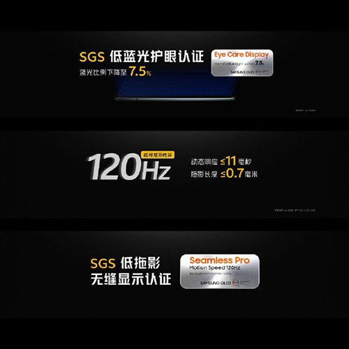 iQOO 5系列搭載三星120Hz超視感AMOLED柔性屏,采用了鉆石像素排列并且支持120Hz的高刷新率,同時還支持HDR10+標準認證和100% DCI-P3色域覆蓋。在防藍光方面,iQOO 5系列通過了SGS屏幕認證,可將屏幕有害藍光減少到7.5%以下,并降低屏幕功耗,同時其動態(tài)拖影長度僅為 0.7mm,動態(tài)影像的響應時間僅為11ms,屏幕反應更為敏捷。