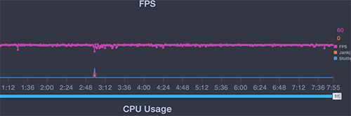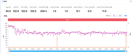 不過(guò),解鎖120幀和HDR高清畫(huà)質(zhì)后,手機(jī)CPU和GPU的壓力劇增,游戲幀率剛開(kāi)始還能維持在100以上,但很快就下降到70-80幀的樣子(平均幀率82),這種狀態(tài)一直持續(xù)到游戲結(jié)束。