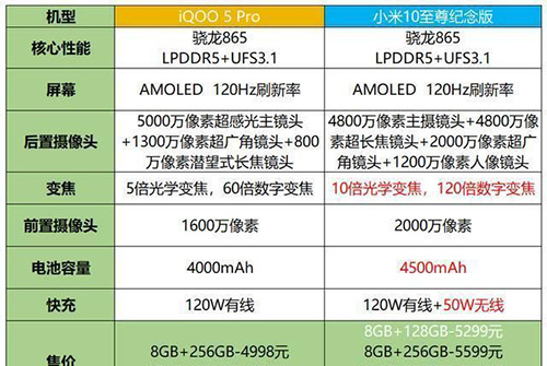 價(jià)格方面,小米10至尊紀(jì)念版的8GB+256GB售價(jià)5599元,12GB+256GB售價(jià)5999元,iQOO 5 Pro分別為4998元和5498元,兩個(gè)版本的差價(jià)分別是500元、600元。