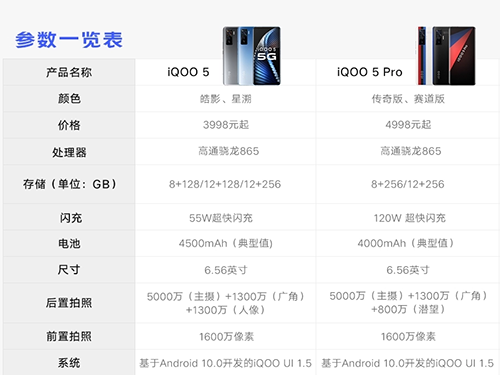 至于相同點,二者都是5000萬主攝、1600萬前攝、驍龍865旗艦平臺、基于Android 10定制的iQOO UI 1.5系統(tǒng)、UFS 3.1閃存及LPDDR5內(nèi)存。