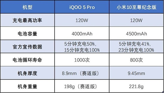 首先,給大家總結(jié)了一下各種官方標(biāo)稱的參數(shù)。iQOO 5 Pro電池容量4000mAh,小米10至尊版容量更大達到了4500mAh,顯然后者給人的續(xù)航安全感更高。也許有朋友會問:現(xiàn)在旗艦手機不都4500mAh左右么?為何iQOO 5 Pro的電池容量不升反降了?