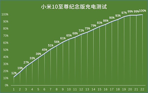 小米10至尊版實測22分鐘即可充滿,比官方標(biāo)稱的23分鐘還少1分鐘。充電過程中最高功率達到了103.1W,但持續(xù)時間只有幾秒,1分鐘時功率已經(jīng)降至86W左右,這樣的功率一直維持到3分鐘;4-7分鐘功率降至69W左右;8分鐘降至60W左右;9到15分鐘降至44W左右;16分鐘降至40W左右;17分鐘電量達到了90%,功率降低速度加快,電量95%時仍能維持25W左右。