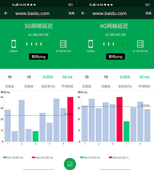 隨后,我們打開專業(yè)網(wǎng)絡(luò)測試工具,測試在5G網(wǎng)絡(luò)和4G網(wǎng)絡(luò)下訪問百度時的延遲。5G網(wǎng)絡(luò)下,iQOO 5最高延遲44.30ms,最低延遲10.40ms,平均延遲26ms。4G網(wǎng)絡(luò)下,iQOO 5最高延遲42.20ms,最低延遲 19.20ms,平均延遲33ms。由此可見,5G網(wǎng)絡(luò)的低延遲優(yōu)勢非常明顯。