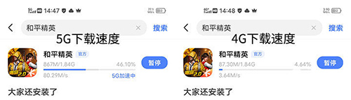 最后,我們分別使用5G網(wǎng)絡(luò)和4G網(wǎng)絡(luò)在應用商店下載和平精英,打開網(wǎng)速監(jiān)控,可以看到,5G網(wǎng)絡(luò)下載的速度約為8.29MB/S,4G網(wǎng)絡(luò)則為3.64MB/S,基本上文的測試結(jié)果一致。從實測結(jié)果來看,iQOO 5的5G網(wǎng)絡(luò)連接能力還是非常出色的。