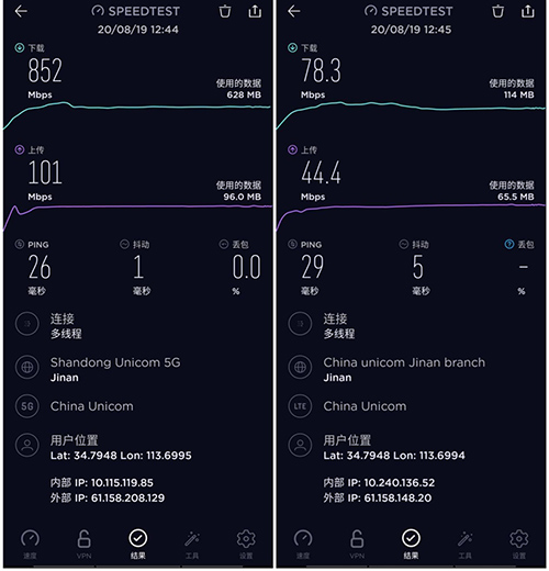 可以看到,在中國聯(lián)通5G網(wǎng)絡(luò)情況下iQOO 5的5G速度實(shí)測下行速率達(dá)到852Mbps,上行速率達(dá)到了101Mbps;聯(lián)通4G速度實(shí)測下行速率為78.3Mbps,上行速率則是44.4Mbps。