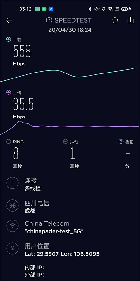 Wi-Fi6需要手機(jī)和路由器同時(shí)支持才能使用,在Wi-Fi6下,我們使用Ace2進(jìn)行測(cè)速,發(fā)現(xiàn)過去一直“跑不滿”的寬帶,這次居然出現(xiàn)了558Mbps的下行速度(帶寬500Mbps),難道是Wi-Fi6的隱藏福利?