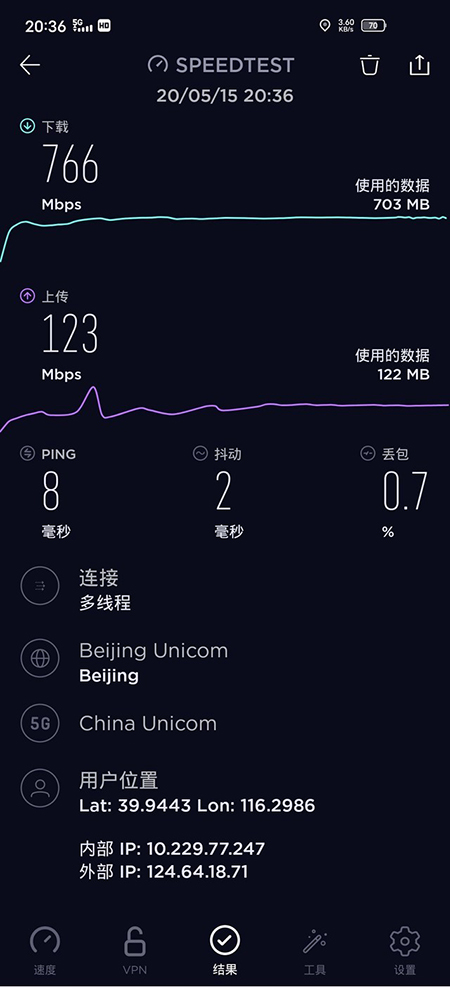 Speedtest實測,iQOO Z1的5G的下載速率為766Mbps,上傳速率達到了123Mbps,這個成績符合測試手機安裝的聯(lián)通5G套餐的網(wǎng)速,而這樣的5G網(wǎng)絡速度是大幅度優(yōu)于4G網(wǎng)絡的。