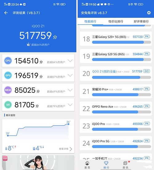 接著來(lái)看GeekBench 4的跑分結(jié)果,手頭目前三部手機(jī)分別是驍龍865、驍龍845以及天璣1000plus,跑分來(lái)看單核性能iQOO Z1與K30Pro大概有10%的差距,而比驍龍845的一加6則有50%的提升。多核方面iQOO Z1和K30 Pro差別非常小。