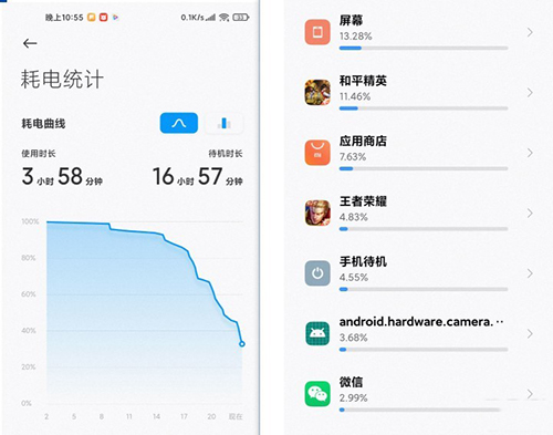 從0點(diǎn)至22點(diǎn)55分,手機(jī)剩余電量為33%。0點(diǎn)至8點(diǎn)手機(jī)一直處于待機(jī)狀態(tài),電量消耗基本為0。測(cè)試期間耗電最大的應(yīng)用分別是相機(jī)(使用時(shí)長(zhǎng)為1小時(shí)49分鐘),王者榮耀(開(kāi)啟高幀數(shù)模式,使用時(shí)長(zhǎng)為44分鐘)和平精英(開(kāi)啟高幀數(shù)模式,使用時(shí)長(zhǎng)為23分鐘)。測(cè)試期間沒(méi)有打接電話(huà),沒(méi)有高強(qiáng)度使用微信(僅僅登錄微信發(fā)了一些信息,使用時(shí)長(zhǎng)約為15分鐘)。假如把打接電話(huà)和使用微信加入進(jìn)去,每日兩充是逃不掉的。好在原配的充電器充電速度極快,中午吃飯前接上充電器,吃完飯回來(lái)手機(jī)就滿(mǎn)血復(fù)活了。但也從側(cè)面反映,小米10至尊版電量確實(shí)不太耐用,希望日后電量管理有所改進(jìn)。