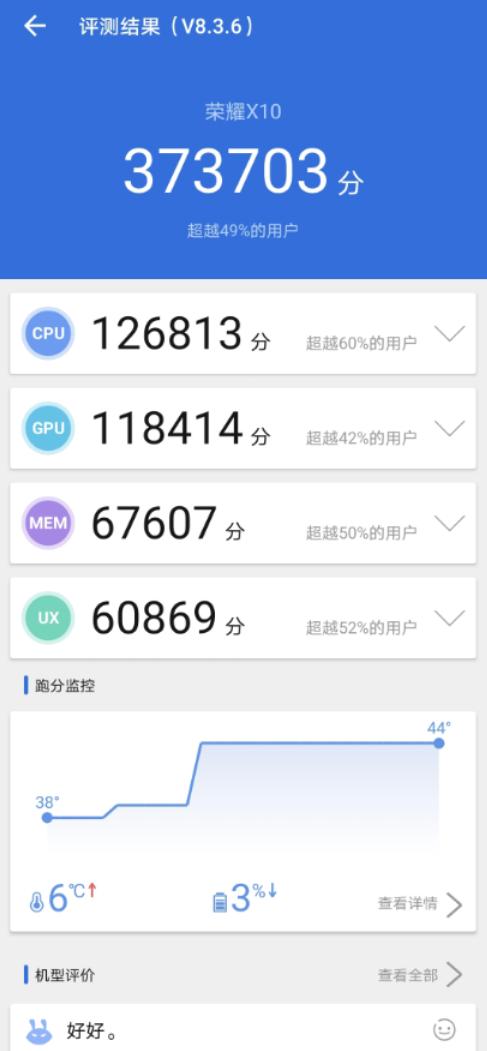 那么,麒麟820+LPDDR4X+UFS2.1,在這樣的組合之下,榮耀X10的性能表現(xiàn)又是如何呢?通過跑分軟件測試得出數(shù)據(jù):安兔兔評測的成績是37.3萬+。