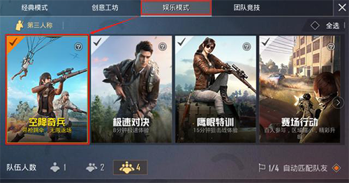 游戲模式:娛樂模式——空降奇兵——四人隊伍自動匹配;
