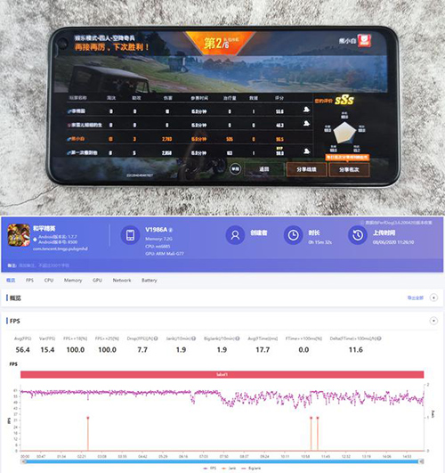使用iQOO Z1打完一局《和平精英》空降奇兵娛樂模式,耗時15分鐘,游戲過程中的平均幀率是56.4FPS,其中平均每十分鐘的卡頓次數(shù)為1.9。通過上圖可以看出,在游戲開始的前七分鐘內(nèi),用iQOO Z1的幀數(shù)表現(xiàn)非常的平穩(wěn),可是當(dāng)玩到第八分鐘以后,幀率就開始出現(xiàn)了極不穩(wěn)定的波動現(xiàn)象。