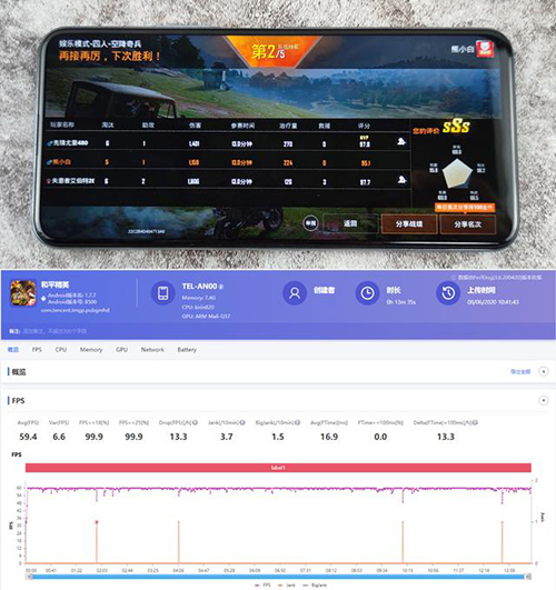 使用榮耀X10打完一局《和平精英》空降奇兵娛樂模式,耗時13分鐘,游戲過程中的平均幀率是59.4FPS,其中平均每十分鐘的卡頓次數(shù)為3.7。通過上圖可以看出,在整個游戲過程中,榮耀X10的幀數(shù)表現(xiàn)非常的平穩(wěn)。