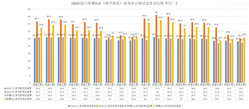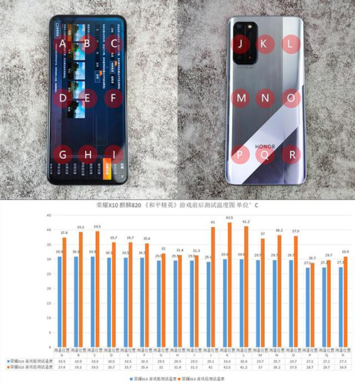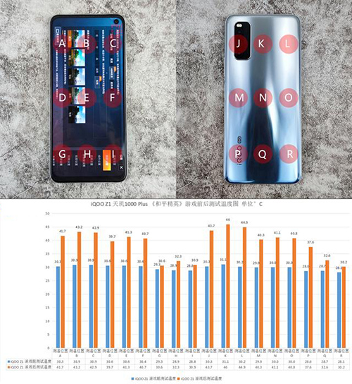 除了系統(tǒng)配置軟硬件的深度優(yōu)化之外,手機(jī)芯片的功耗發(fā)熱程度、手機(jī)內(nèi)置的散熱系統(tǒng),也是決定了游戲體驗是否表現(xiàn)更佳的一項重要的因素。在上面的游戲體驗測試環(huán)境中,我們也分別對iQOO Z1和榮耀X10兩款手機(jī)進(jìn)行了游戲前后的機(jī)身表面溫度測試,測試的選取了機(jī)身正反面共十八個位置。