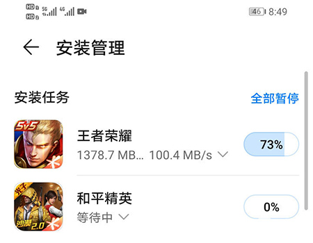 使用5G網絡進行實際游戲下載時,華為暢享20 Pro的下載速度約為100.4MB/S,換算一下約為803.2Mbps,也比較接近理論上的測速了。
