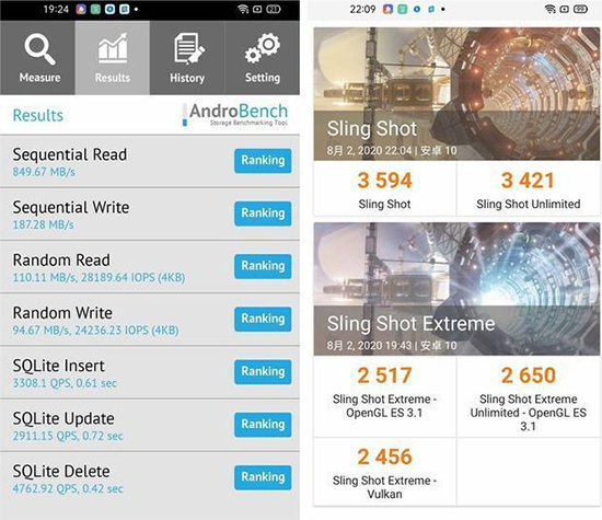 使用的是AndroBench中存儲(chǔ)測(cè)試,realme 真我V5順序讀取速度為849.67MB/s,順序?qū)懭胨俣葹?87.28MB/s,隨機(jī)讀取速度為110.11MB/s,隨機(jī)寫入速度為94.67MB/s,充分保障設(shè)備性能及運(yùn)行效率。