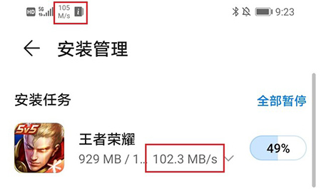 在5G網(wǎng)絡(luò)下載軟件的測試中,華為暢享20 Pro跑出了102.3MB/s的速率,這和上面SpeedTest的測試結(jié)果是相互對應(yīng)的,可以看出華為暢享20 Pro的整機5G性能還是較為理想的。