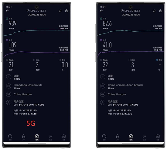 可以看到,在中國(guó)聯(lián)通5G網(wǎng)絡(luò)情況下三星Galaxy Note20 Ultra的5G速度實(shí)測(cè)下行速率達(dá)到939Mbps,上行速率達(dá)到了109Mbps;聯(lián)通4G速度實(shí)測(cè)下行速率為82.6Mbps,上行速率則是41Mbps。