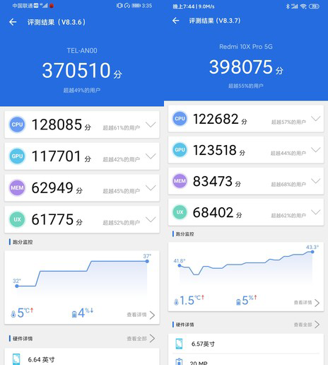 對(duì)比來(lái)看Redmi 10X Pro,它的總分為398075分,超越市面上55%的用戶。具體各個(gè)方面來(lái)看,CPU跑分122682分、GPU跑分123518分、UX跑分68402分、MEM跑分83473分。從安兔兔跑分來(lái)看,Redmi 10X Pro的性能要高于榮耀X10。
