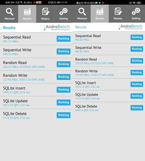在AndroBench存儲(chǔ)測(cè)試中,榮耀X10的順序讀取速度為841.35MB/s,順序?qū)懭胨俣葹?84.52MB/s,Redmi 10X Pro的順序讀取速度為982.85MB/s,順序?qū)懭胨俣葹?82.87MB/s。從數(shù)據(jù)來(lái)看,二者打的有來(lái)有回,在順序讀取速度上Redmi 10X Pro領(lǐng)先,而在順序?qū)懭胨俣壬蟿t是榮耀X10領(lǐng)先。