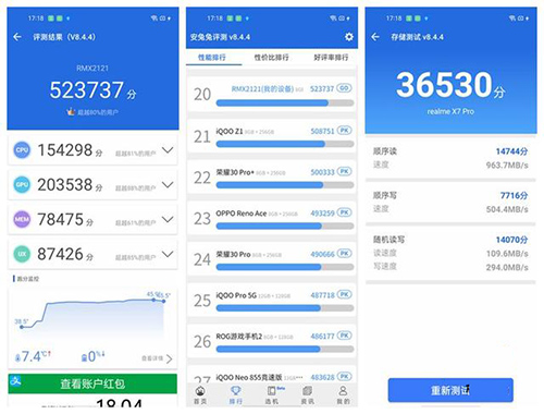 實(shí)際測(cè)試結(jié)果來看,realme 真我X7 Pro的天璣1000+處理器的性能表現(xiàn)還是比較出色的,在安兔兔跑分中已經(jīng)能夠達(dá)到52萬多分,其中CPU部分為154298分,GPU部分得分為203538分。