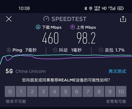 我們也用Speedtest給真我X7 Pro測了一次速,通過實(shí)際測試發(fā)現(xiàn):真我X7 Pro的下行速率為460Mbps,上行速率為98.2Mbps,Ping值為7毫秒,抖動1毫秒,整體表現(xiàn)非常出色。