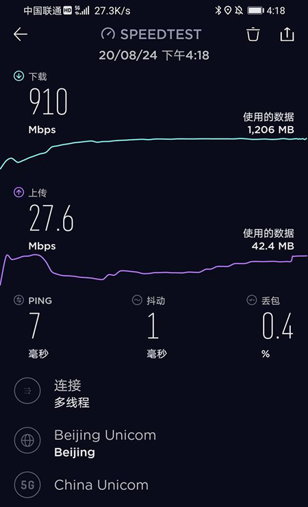華為暢享20 Plus在北京聯(lián)通5G下使用SpeedTest的實(shí)測(cè)表現(xiàn)是下傳速率為910Mbps,接近當(dāng)前5G商用的網(wǎng)速上限。