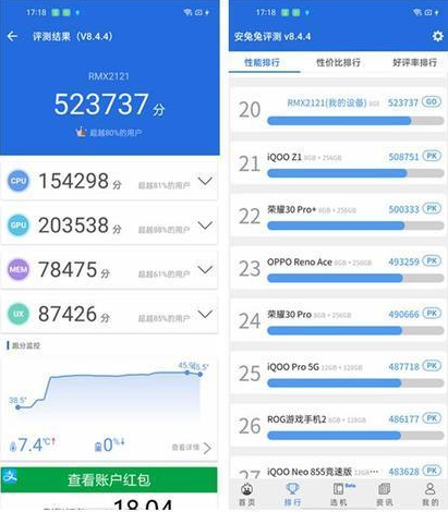 實際測試結(jié)果來看,realme 真我X7 Pro的天璣1000+處理器的性能表現(xiàn)還是比較出色的,在安兔兔跑分中已經(jīng)能夠達(dá)到52萬多分,其中CPU部分為154298分,GPU部分得分為203538分。