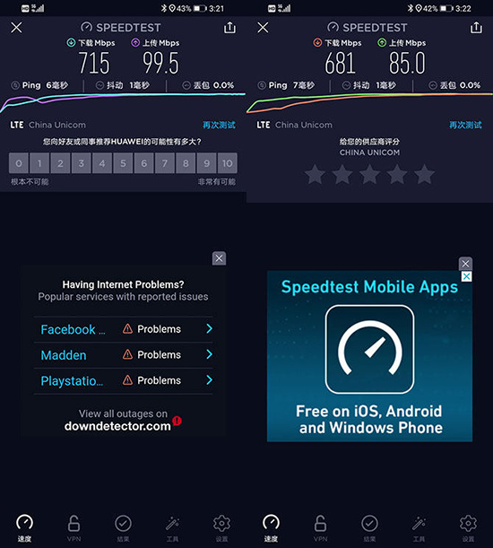華為暢享20采用5G SoC,內(nèi)置了雙模5G基帶,能同時(shí)支持SA個(gè)NSA雙模5G。我們使用電信的5G網(wǎng)絡(luò)對(duì)于華為暢享20進(jìn)行測(cè)試,可以看到下載速度5G網(wǎng)絡(luò)達(dá)到了715Mbps,上載速度5G網(wǎng)絡(luò)有99.5Mbps,4G網(wǎng)絡(luò)只有43.8Mbps,上載的差距并沒有太大。而延時(shí)方面5G網(wǎng)絡(luò)達(dá)到了6ms,抖動(dòng)1ms, 5G網(wǎng)絡(luò)擁有低延時(shí)的優(yōu)勢(shì)。這個(gè)速度只是理論速度,而實(shí)際的5G對(duì)于我們?nèi)粘5南螺d體驗(yàn)又是如何?