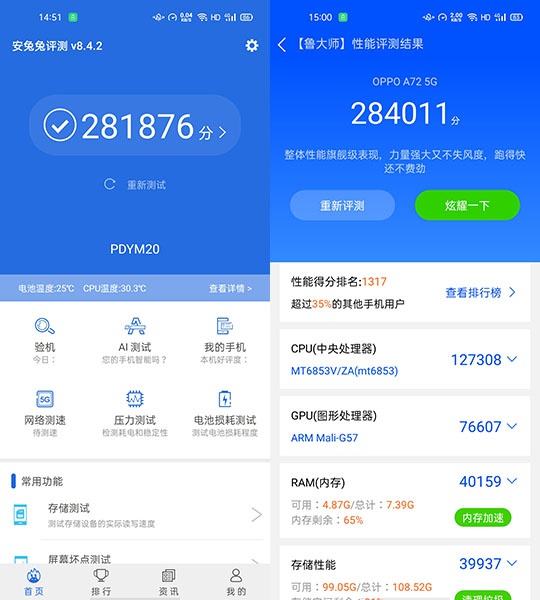 搭載天璣720芯片的OPPO A72有著較為良好的性能表現(xiàn),在基準(zhǔn)測(cè)試軟件中均有著不錯(cuò)的測(cè)試成績(jī)。安兔兔評(píng)測(cè)跑分成績(jī)超過(guò)28萬(wàn)分,魯大師性能評(píng)測(cè)同樣超過(guò)28萬(wàn)分。對(duì)于一款2000元以下價(jià)格的手機(jī),這樣的綜合表現(xiàn)其實(shí)就不錯(cuò)了。