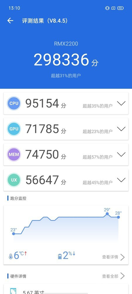 從跑分測(cè)試結(jié)果來(lái)看,真我V3的安兔兔跑分為298336分,超越31%的用戶,在百元級(jí)價(jià)位段是比較突出的。具體到各個(gè)子項(xiàng)跑分,真我V3的CPU得分為95154分,GPU得分為71785分,UX得分為56647分,MEM得分為74750分。