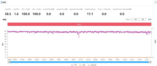 對于《王者榮耀》來說,如果手機(jī)性能不足的話,游戲過程中會出現(xiàn)卡頓、掉幀等問題。尤其是在5V5團(tuán)戰(zhàn)時(shí)刻,各種技能特效的疊加對手機(jī)性能提出了更高的要求。通過實(shí)測發(fā)現(xiàn),真我V3的平均幀率可以保持在58.5fps,幀率表現(xiàn)基本穩(wěn)定,在14分鐘的全局游戲中,團(tuán)戰(zhàn)時(shí)刻偶爾會有幀率波動,但不會卡頓,整體游戲體驗(yàn)較為出色。
