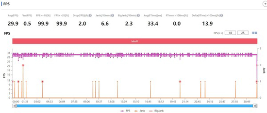 從測試歷史來看,《和平精英》比《王者榮耀》更吃性能。對于真我V3來說,可以開啟“高清”和“高”幀數(shù)的設(shè)置。從將近30分鐘的測試結(jié)果來看,真我V3的平均幀率可以達(dá)到29.9fps,游戲過程中不論是激烈的射擊場景還是駕車快速行駛場景,幀率并沒有太大的波動,大家可以放心玩耍。