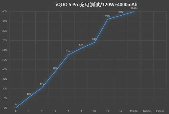 如上圖所示,在測試(亮屏充電)中,iQOO 5 Pro僅需17分鐘就完成了從關(guān)機到100%充滿的充電過程,其中,充到50%僅耗時6分鐘,充電10分鐘的時候電量已經(jīng)接近70%,而充滿共用了17分鐘。