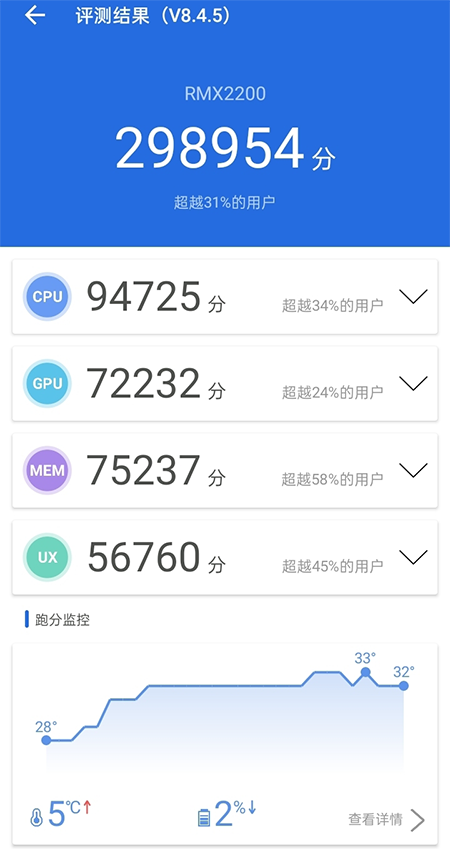 用大家熟悉的安兔兔測試一下跑分成績,realme 真我V3的真實跑分為298954分,超越了31%的用戶,在千元以下的手機中屬于中上水平。