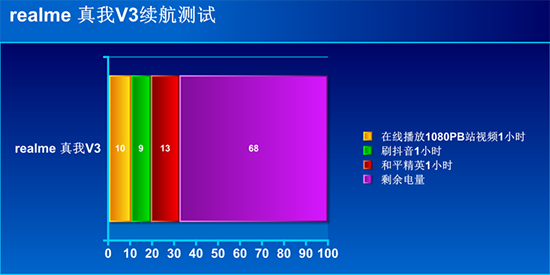 同樣條件下接著刷抖音一小時后,電量從90%下降到81%,也就是耗電9%;對于特別喜歡玩游戲的朋友來說,手機的續(xù)航表現(xiàn)會直接影響游戲體驗。我們也進行了1個小時的游戲續(xù)航測試,性能模式下玩一個小時《和平精英》,手機電量從81%降到68%,也就是玩1個小時游戲僅耗電13%。經(jīng)過三小時重度續(xù)航使用,realme 真我V3最終剩余68%,至于日常使用掉電比較慢,續(xù)航方面還是擁有十分不錯的表現(xiàn)。超大容量電池5G手機,續(xù)航更加持久。