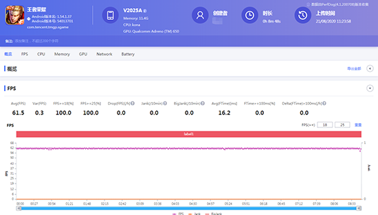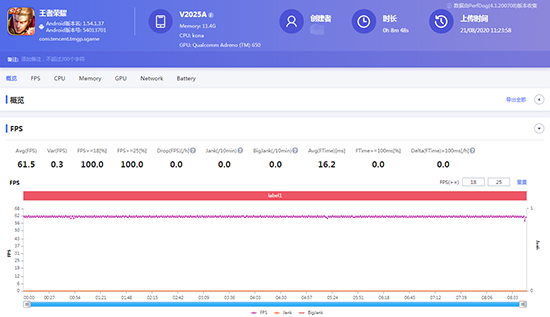 首先運行的是《王者榮耀》,在畫質(zhì)全高并且開啟高幀率模式的情況下,iQOO 5 Pro在運行的過程中沒有出現(xiàn)絲毫的卡頓。上方PerfDog所展示出的穩(wěn)定的幀數(shù)曲線,也恰恰符合了我的體驗。在長達(dá)20分鐘的游戲中,iQOO 5 Pro的平均幀率保持都保持在59.9fps,而且從游戲全程的幀率曲線來看,20分鐘內(nèi)波動并不是很大,整體游戲體驗下來非常出色。