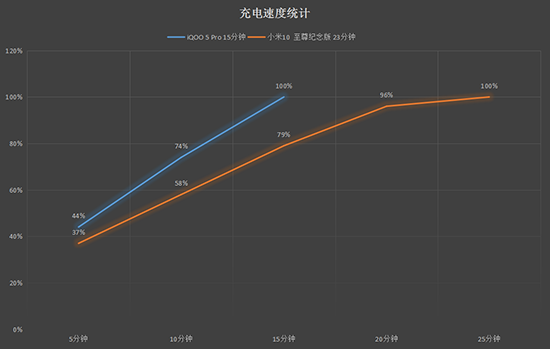 在120W超快閃充面世之前,業(yè)界最快的充電方案也不過剛剛過半,成倍的提升,讓iQOO 5 Pro和小米10至尊紀念版都有著瞬時的充電速度。經(jīng)過實測發(fā)現(xiàn),兩部手機的實際充電時間也與官方宣稱相差無幾,iQOO 5 Pro更有效率一些,實際是以15分鐘實現(xiàn)從0%到100%的電量輸入,而小米10至尊紀念版稍慢些,不過也能以23分鐘補足。