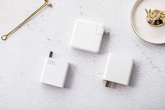 而由于充電功率的成倍增加、充電器端的體積也相對來說大一些,但也不算太大,用這些許的肩上重量換來跨時代的充電體驗還是比較值的。兩款充電器和MacBook的充電頭放在一起比較,也要輕巧一些。