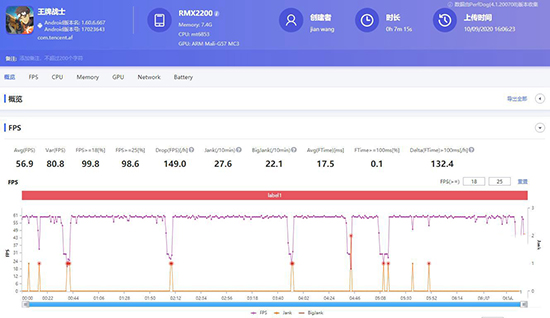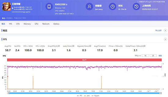 在王者榮耀環(huán)節(jié)首先將游戲幀率、畫質(zhì)開到高(目前不支持超高分辨率),打開角色描邊等選項。realme 真我V3 5G都能夠在極高畫質(zhì)下游戲19分鐘,平均幀率58.7fps,平均每10分鐘卡頓次數(shù)為1.6,平均每10分鐘嚴(yán)重卡頓次數(shù)0.5,詳細(xì)數(shù)據(jù)具體如下圖。