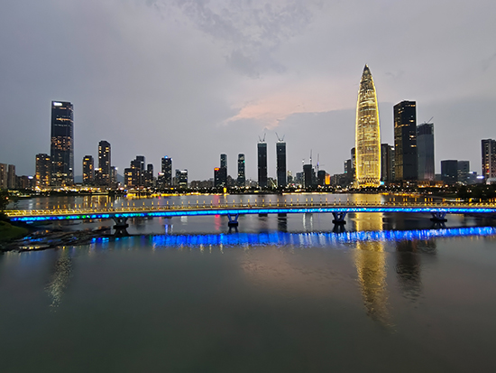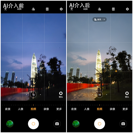 而前面提到的iQOO 5在黃昏與人造光源下的白平衡概率失準(zhǔn)問題,我們猜測其原因之一很可能是因為沒有搭載色溫傳感器,而另一個原因則或許是AI場景智能的“負(fù)優(yōu)化”。例如在藍(lán)調(diào)時間下拍攝的場景,天空與地面積水的反光本就應(yīng)該是藍(lán)色,但iQOO 5卻會出現(xiàn)白平衡不符合實際觀感、色溫偏暖的現(xiàn)象。而在時間接近的另一場景下,我們也通過截圖記錄了AI場景智能觸發(fā)前后的情況。
