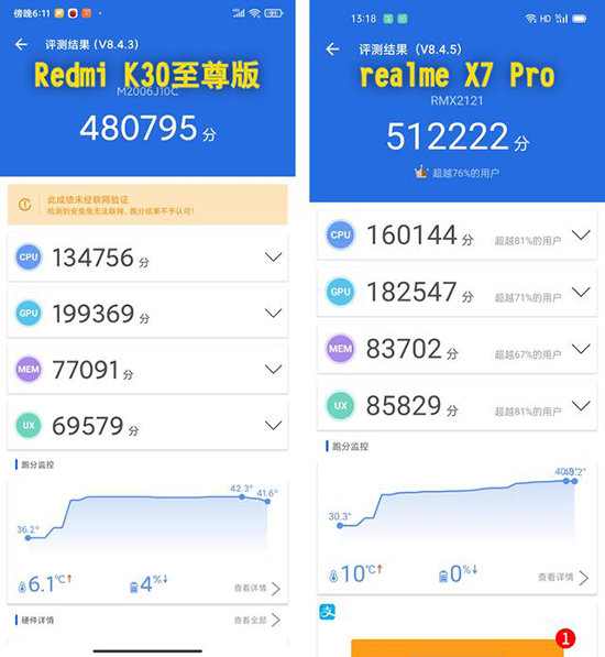 關(guān)于手機(jī)的跑分相信不少的人都看過了,不過跑分僅供參考不代表性能孰優(yōu)孰劣,realme X7 Pro與Redmi K30至尊版安兔兔跑分,分別是51萬分和48萬分,版本都是8G+128G版本,需要注意的是,Redmi K30至尊版跑完分后總顯示無法連接互聯(lián)網(wǎng),所以兩款天璣1000+手機(jī)存在跑分差異,也許與聯(lián)網(wǎng)有關(guān)。